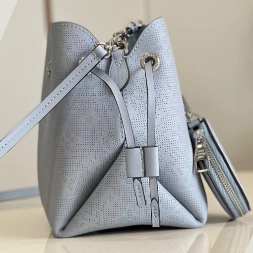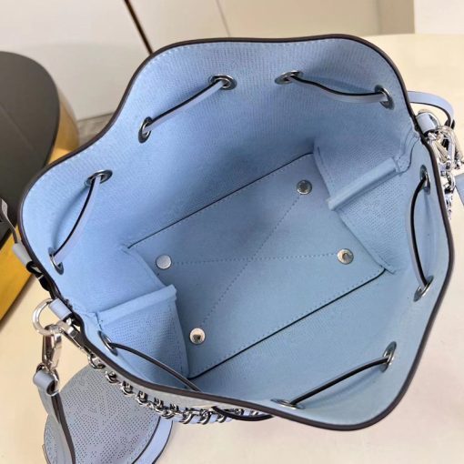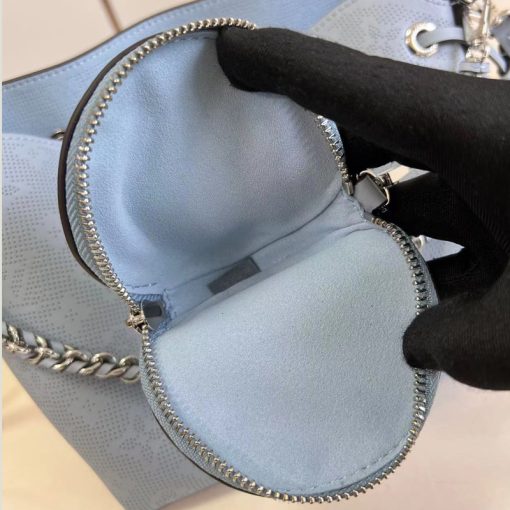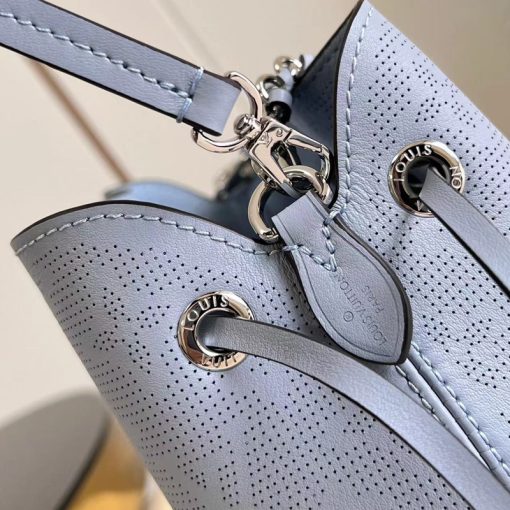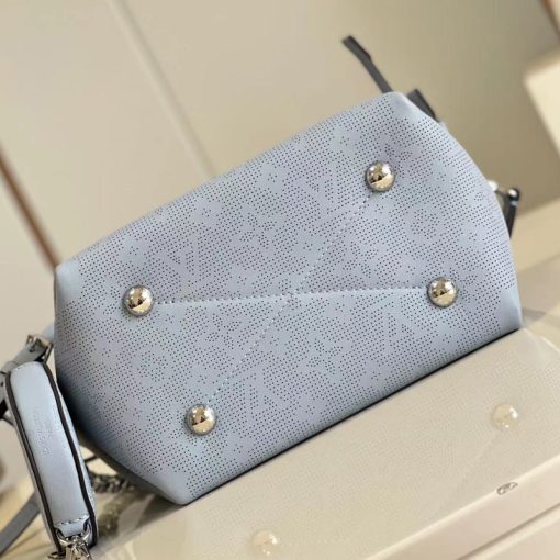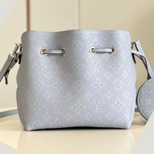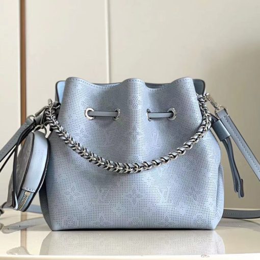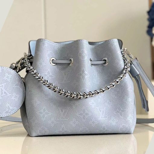 This Bella bucket bag, along with its attached coin purse, is crafted from Mahina calfskin leather, featuring plain LVs and Monogram Flowers surrounded by over 60,000 distinct perforations. The design is completed with tone-on-tone leather trim and silver-color hardware. It boasts a braided handle and an adjustable, removable leather shoulder strap for versatile carrying options. This exquisite bag combines fashion and functionality, making it a perfect choice to showcase personal taste and style. Whether for daily use or special occasions, it adds a touch of sophistication to your ensemble.