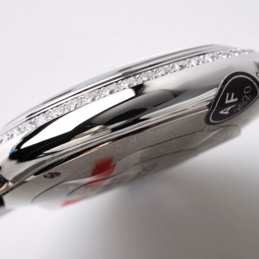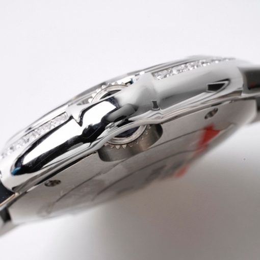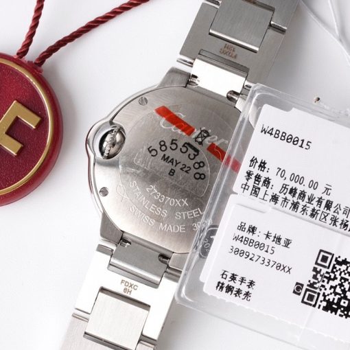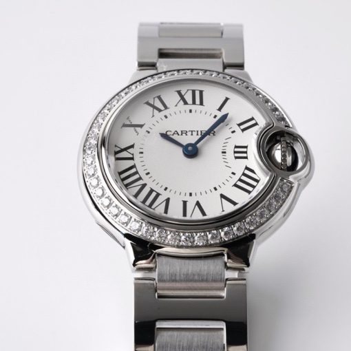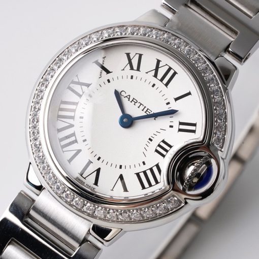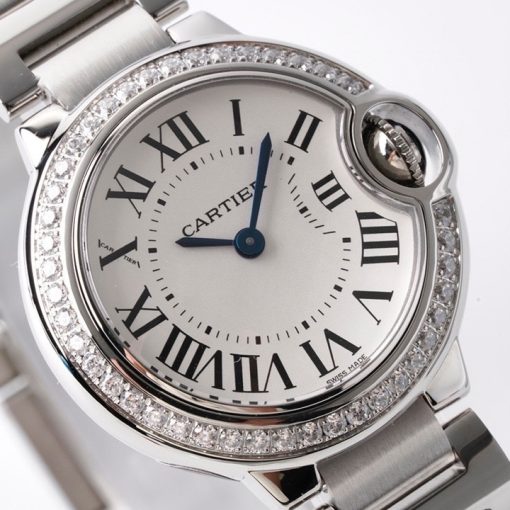 Stainless steel Cartier Ballon Bleu automatic watch featuring a silver Roman dial with a diamond bezel. The watch is 33mm and is attached to a stainless steel bracelet.