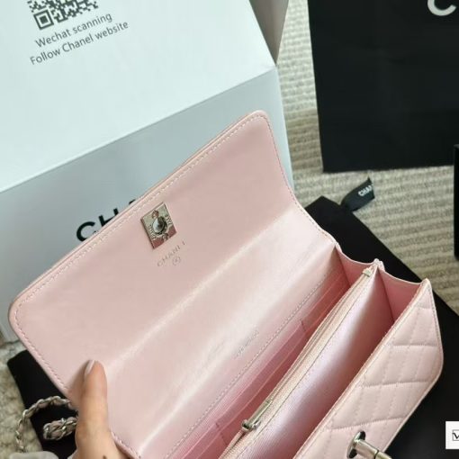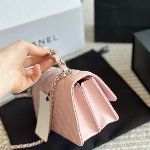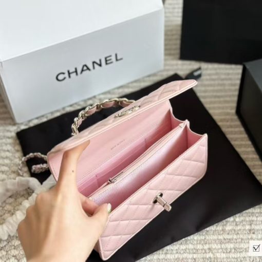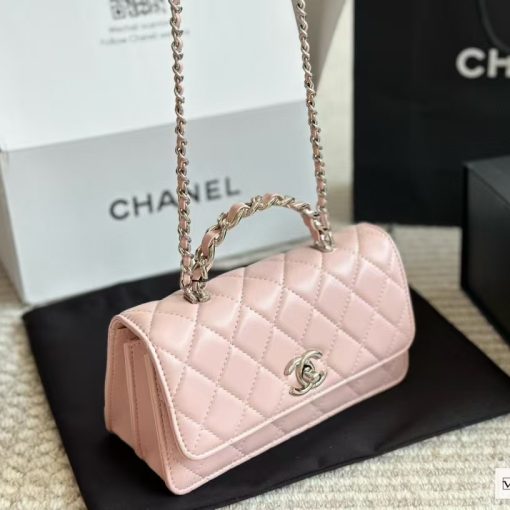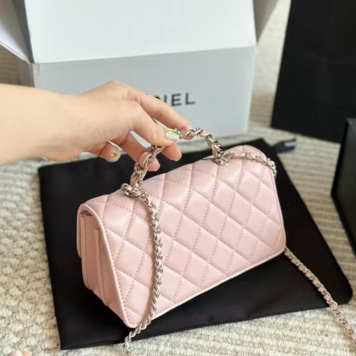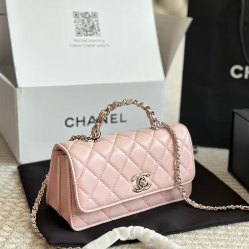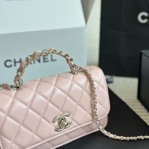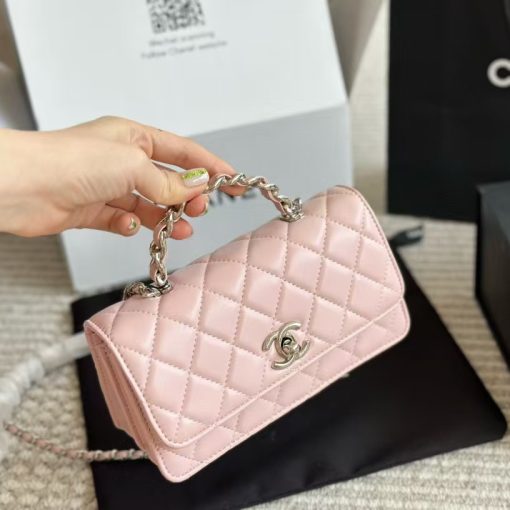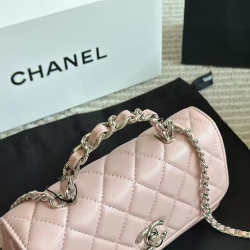 This Mini Rectangular flap bag with top handle is in pink lambskin leather with gold tone hardware, front flap with CC turnlock closure, half moon back pocket, top handle and single interwoven antique gold tone chain link and pink leather shoulder/crossbody strap.