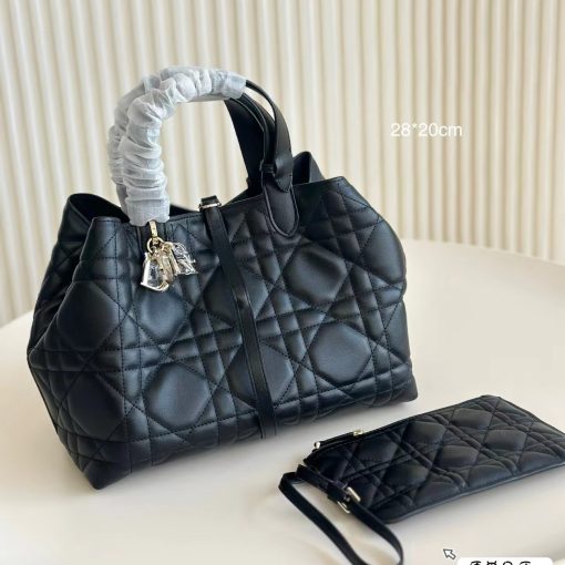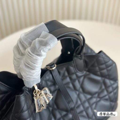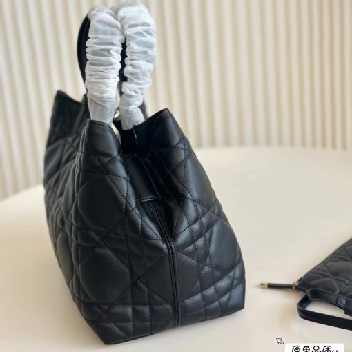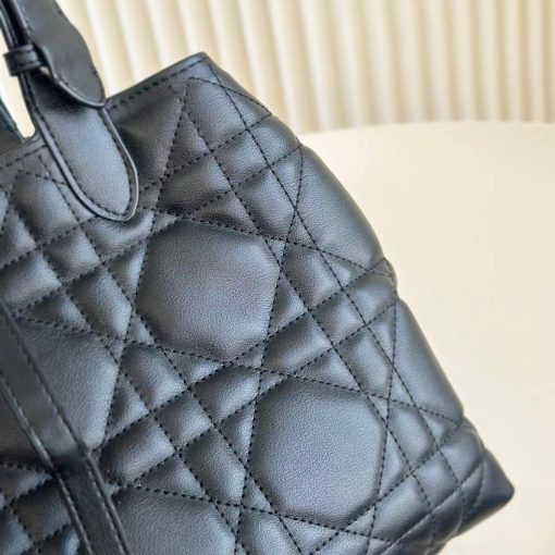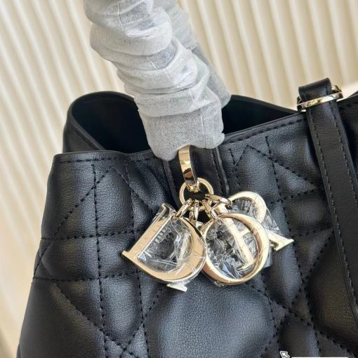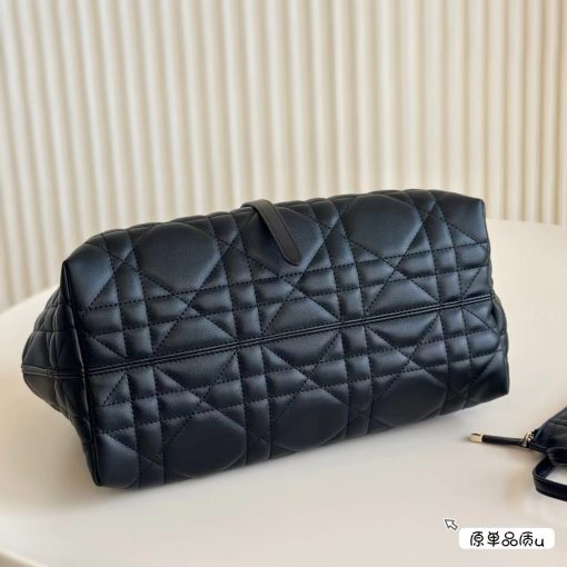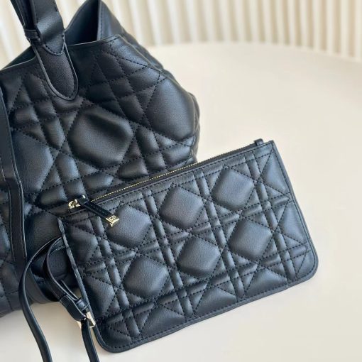 Unveiled at the Spring-Summer 2023 Fashion Show, the Dior Toujours bag is distinguished by a casual and practical design. Crafted in black calfskin with Macrocannage topstitching, it showcases a spacious interior compartment with a matching pouch to organize the essentials. Its thin leather strap closure keeps items secure while the D of the CD Lock clasp twists to adjust the sides and enhance the bag’s silhouette. The leather handles can be adjusted using the small notches in order to be able to carry the medium bag by hand or wear it over the shoulder.