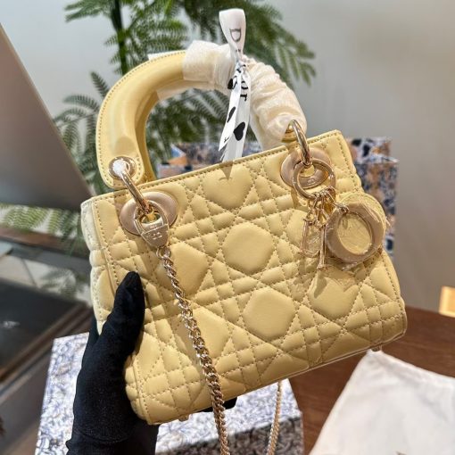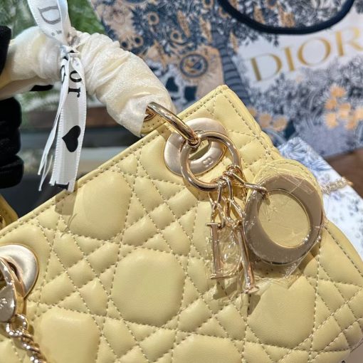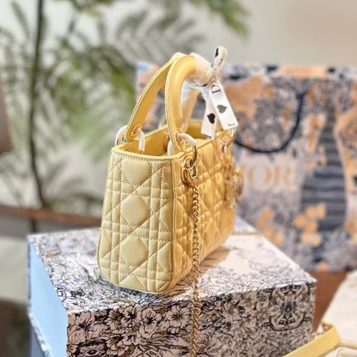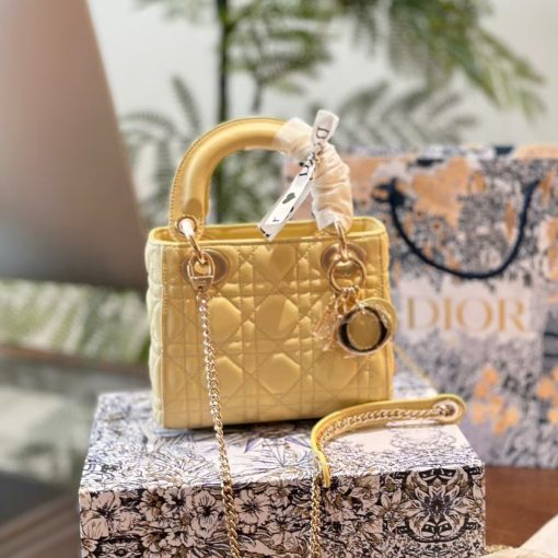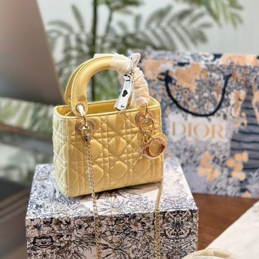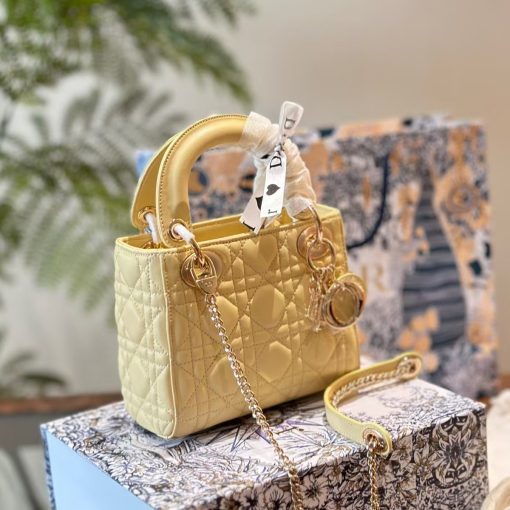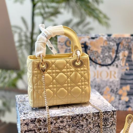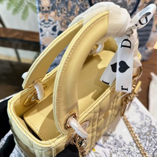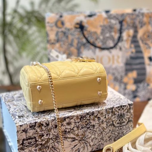 The Lady Dior bag epitomizes the House’s vision of elegance and beauty. Sleek and refined, the style is timeless. It is crafted in butter color lambskin with Cannage stitching, creating the instantly recognizable quilted texture. The pale gold-finish metal D.I.O.R. charms embellish and illuminate its silhouette. Featuring a removable chain shoulder strap, the miniature Lady Dior bag can be carried by hand or worn crossbody as an ideal evening wear companion.