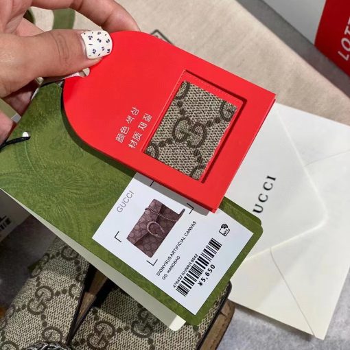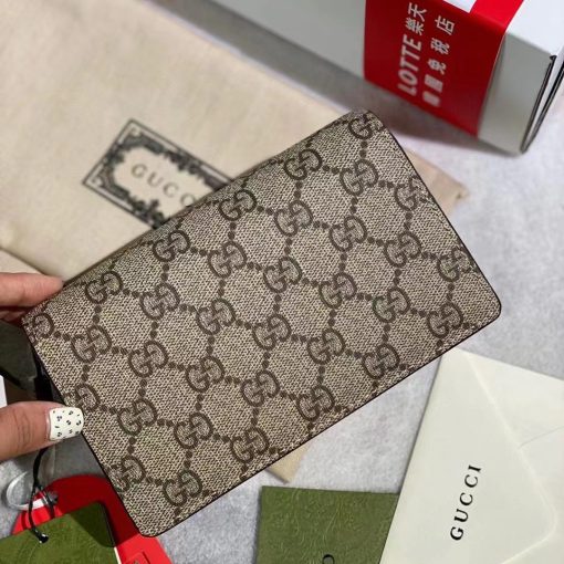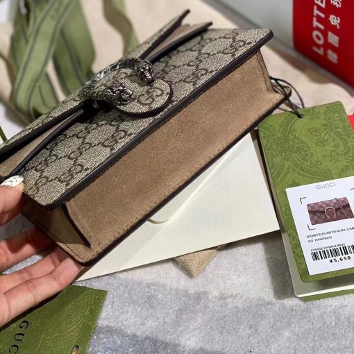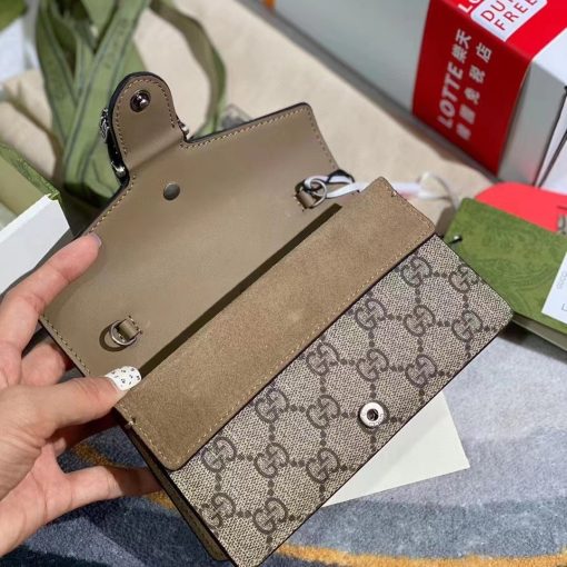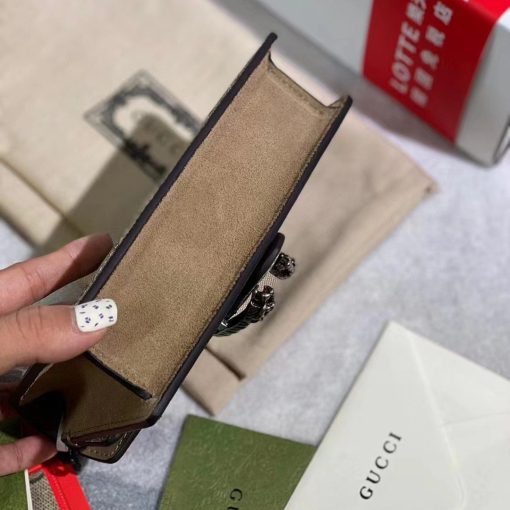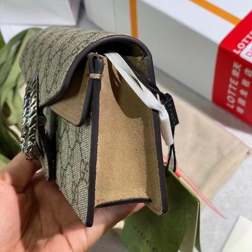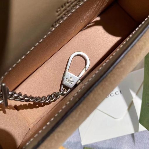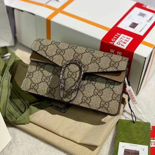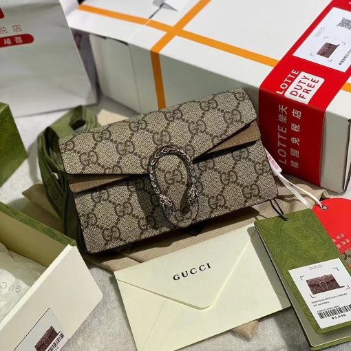 A structured GG Supreme canvas chain super mini shoulder bag with a key ring that can be used to attach this bag to a separate larger bag. The closure has the textured tiger head spur closure-a unique detail referencing the Greek god Dionysus, who in myth is said to have crossed the river Tigris on a tiger sent to him by Zeus. The accessory can also be worn as a crossbody bag.