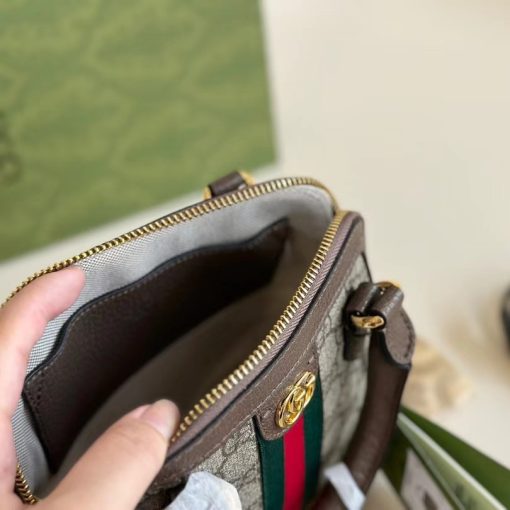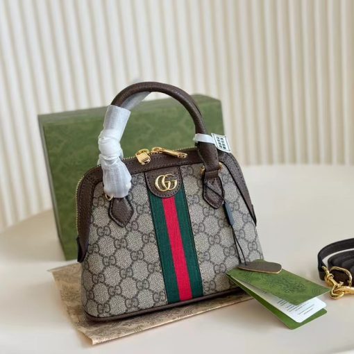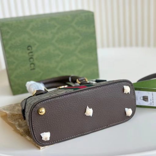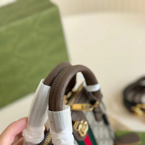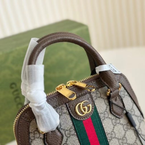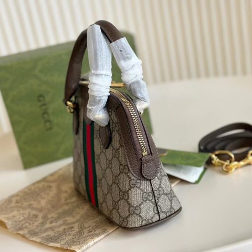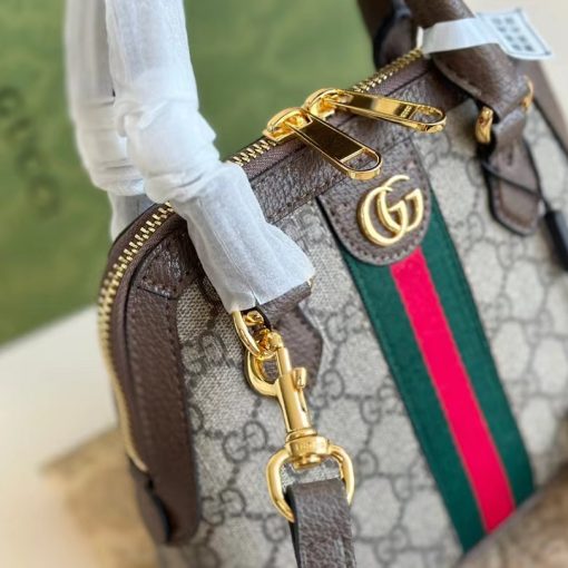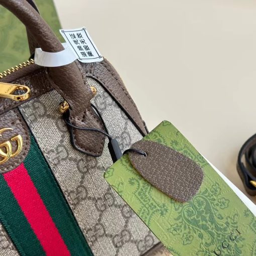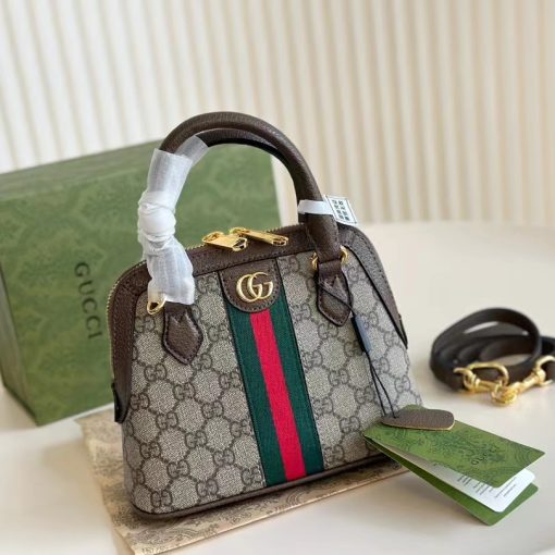 Handbag crafted in beige and ebony GG Supreme fabric characterized by brown leather finishes, gold-colored metallic finishes, zip closure, two handles, one adjustable and removable shoulder strap and cotton and linen lined interior with a pocket. The design is completed by the green and red Web and the unmistakable metal Double G detail.
