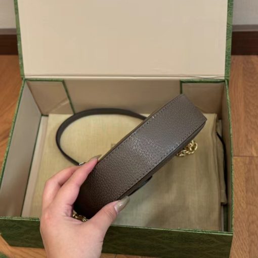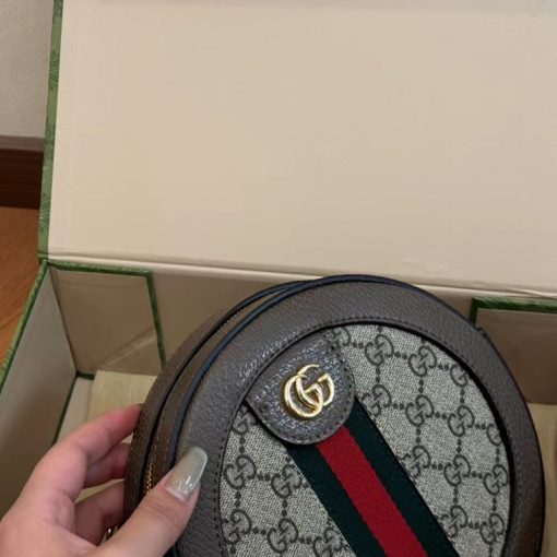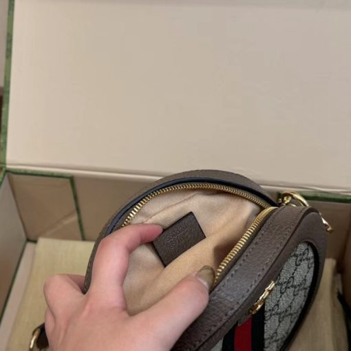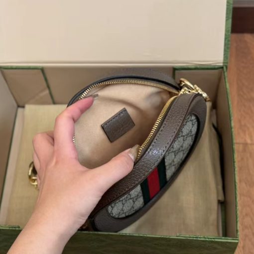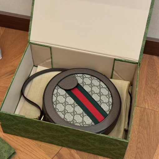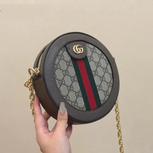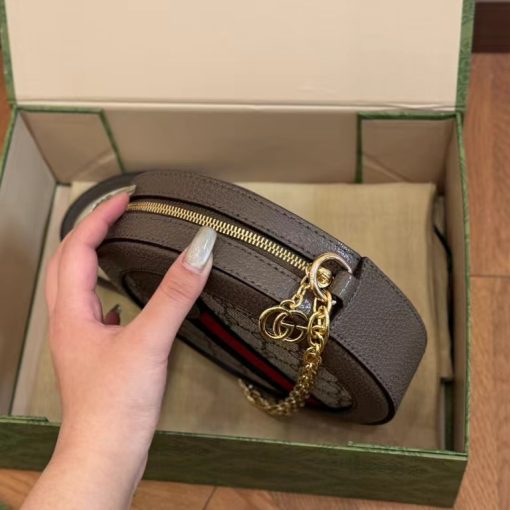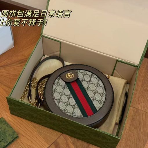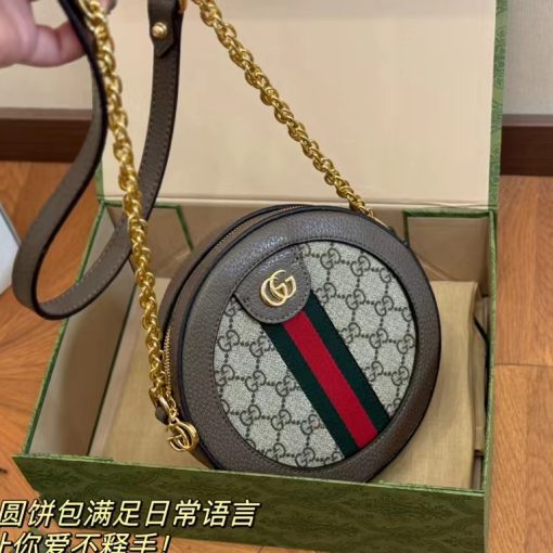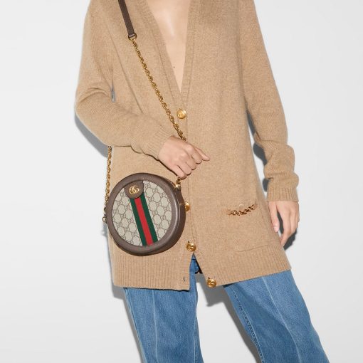 The world of Ophidia evolves with the introduction of a round mini bag with a chain shoulder strap. Crafted in GG Supreme canvas with inlaid green and red Web stripe, the accessory is enhanced by a petite play on the Double G, an archival Gucci code from the ’70s that appears atop a leather tab detail and on the zipper pull.