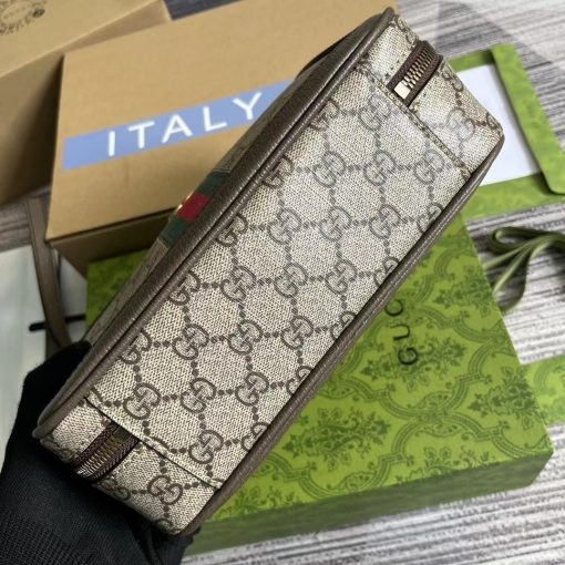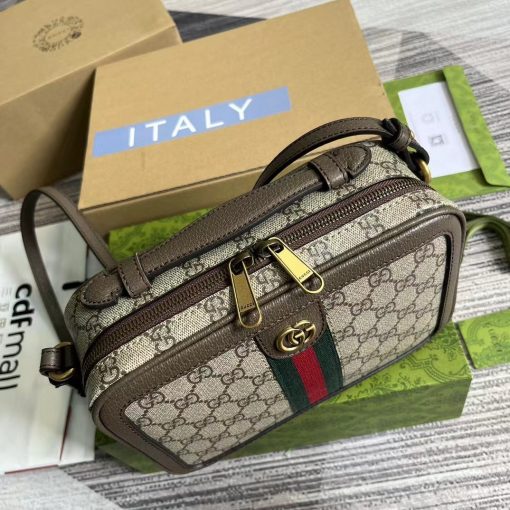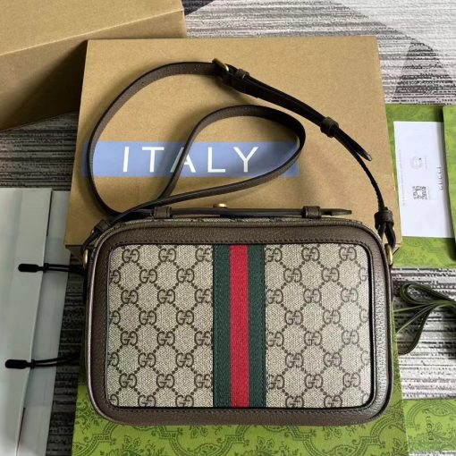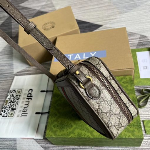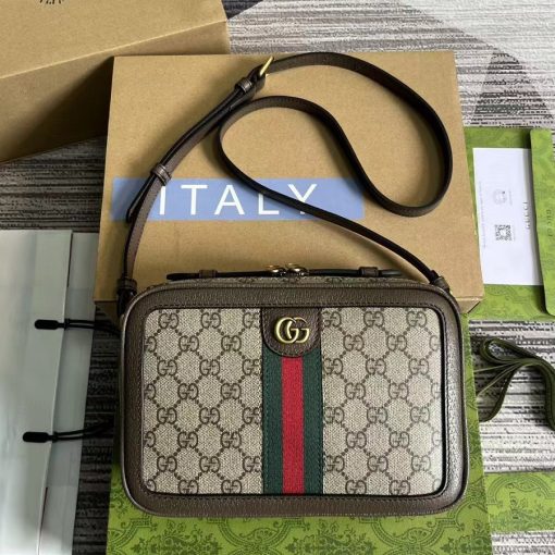 The Ophidia line continues to be one of Gucci signature handbags. New silhouettes are introduced each season, providing versatile travel accessories to suit any destination. The Double G and Web stripe remain integral to the design, presented atop this crossbody bag alongside the signature GG Supreme canvas in beige and ebony.