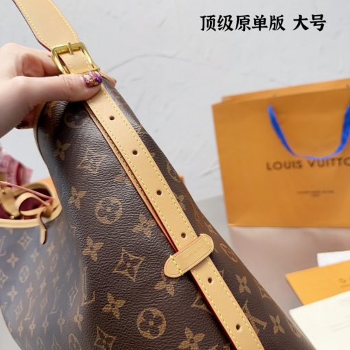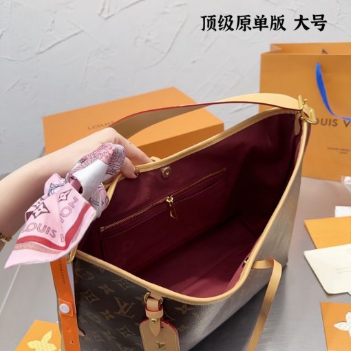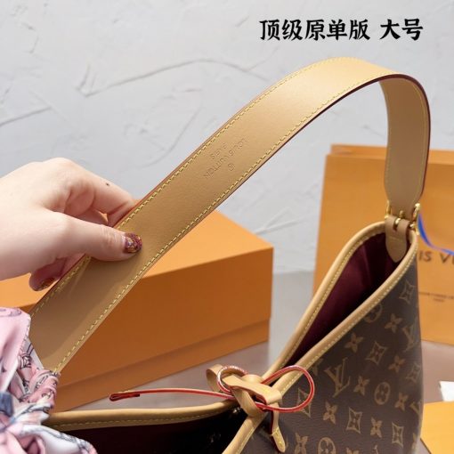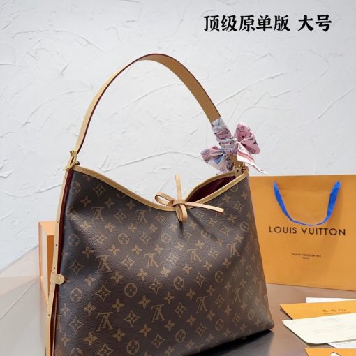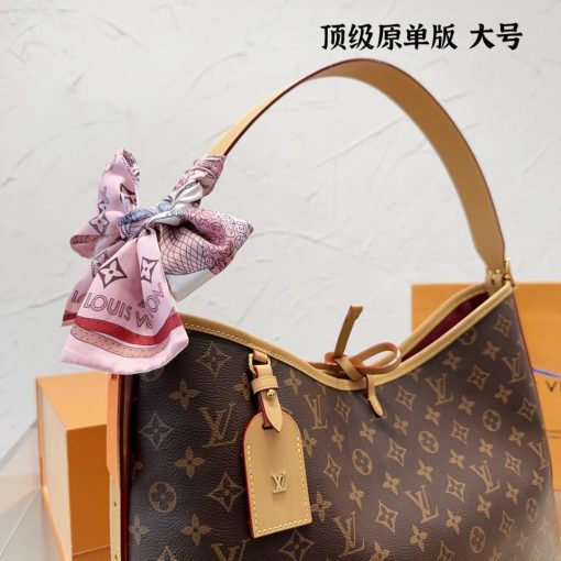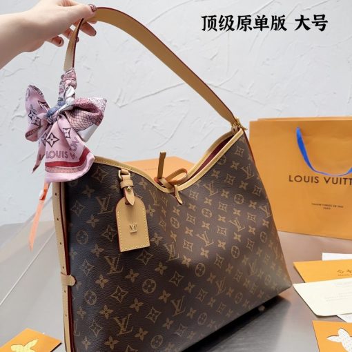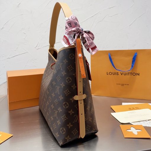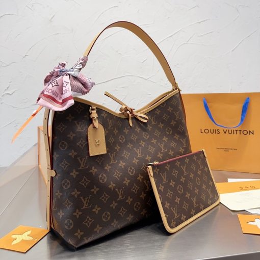 Louis Vuitton launches the CarryAll MM handbag in Monogram canvas with natural leather trim. Its contemporary, body-friendly design and roomy interior make this a fantastic everyday bag. Inside zipped pockets and a removable zipped pouch deliver even more functionality. A gold-color buckle allows the handle to be shortened or lengthened.