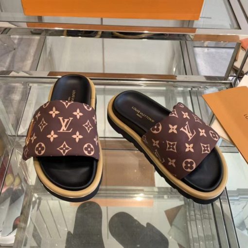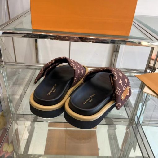 The Pool Pillow Flat Comfort Mules feature padded front straps in Monogram nylon. The straps are adjusted with velcro and embellished with a leather label embossed in gold with the Louis Vuitton signature. Designed for optimum comfort, this model has a padded anatomic footbed and a lightweight micro outsole.