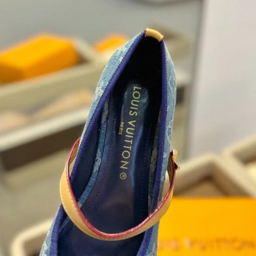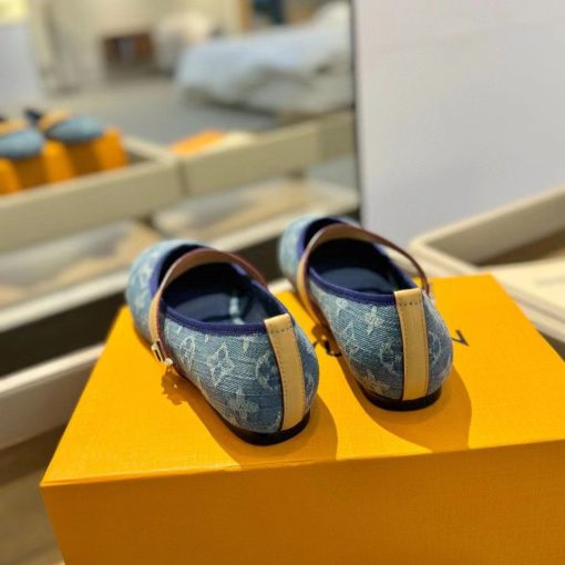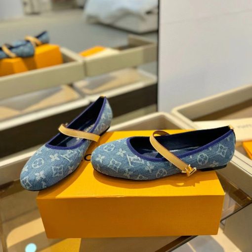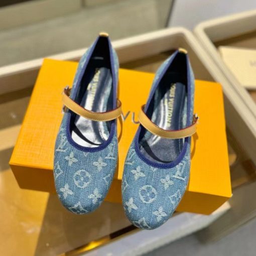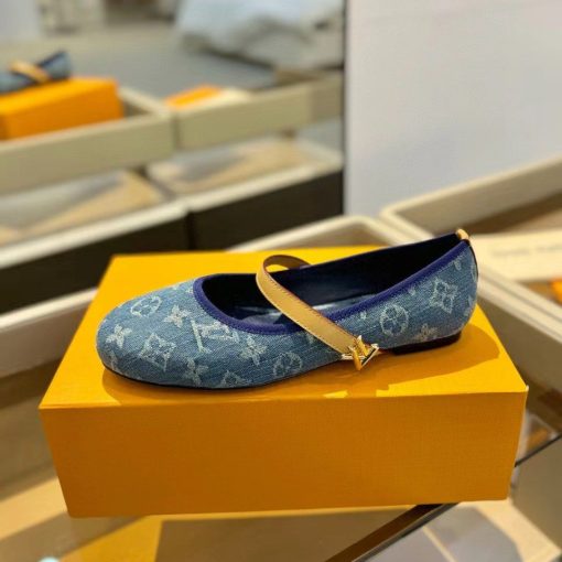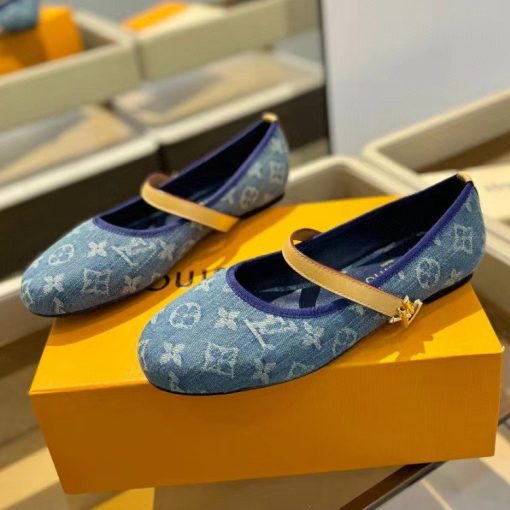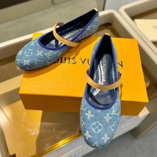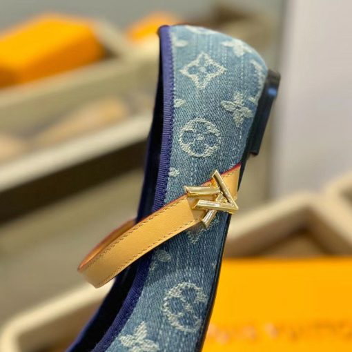 This summery edition of the Romy flat ballerina comes in Monogram denim for a casual-chic look. This update of the classic ballet pump is distinguished by its rounded toe and refined details, notably its slender strap in Louis Vuitton’s emblematic natural leather, which is signed with a gold-tone LV Twist accessory.
