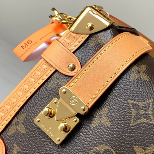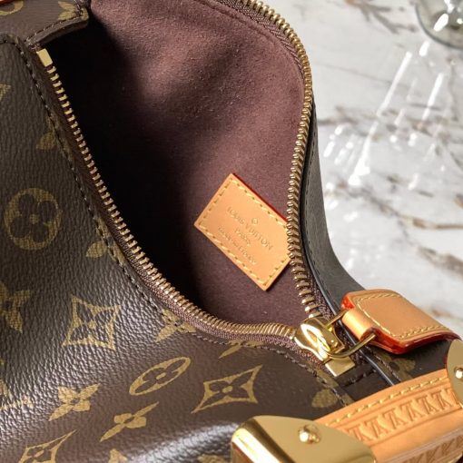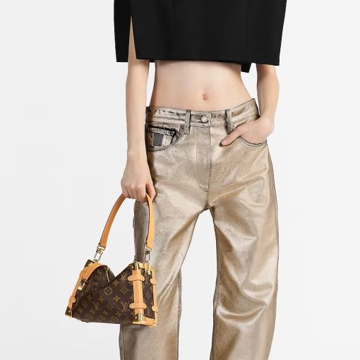 Returning to the House’s trunkmaking beginnings, Nicolas Ghesquière creates the Side Trunk MM handbag in Monogram canvas with leather trim. What strikes the eye is the singularity of the leather zip tab fitted with the iconic S-lock and the reinforced metallic corners. The wide top handle is removable as is the thin leather shoulder strap.