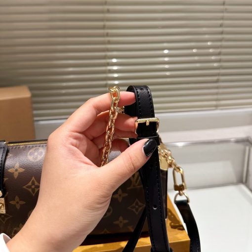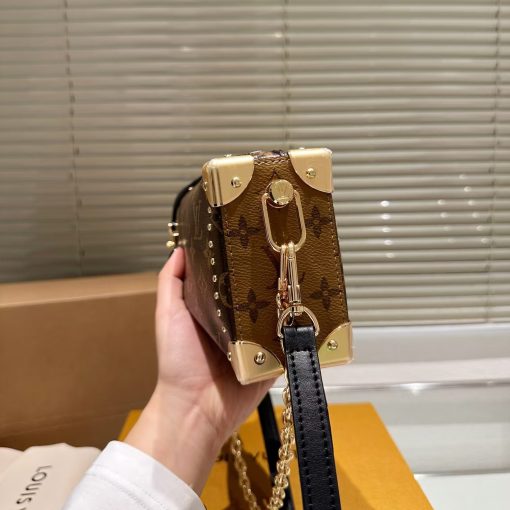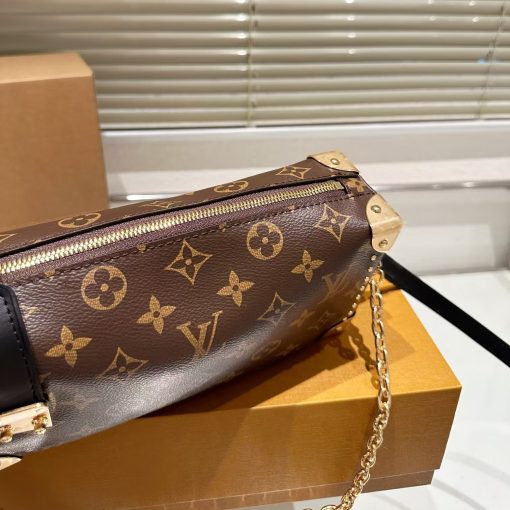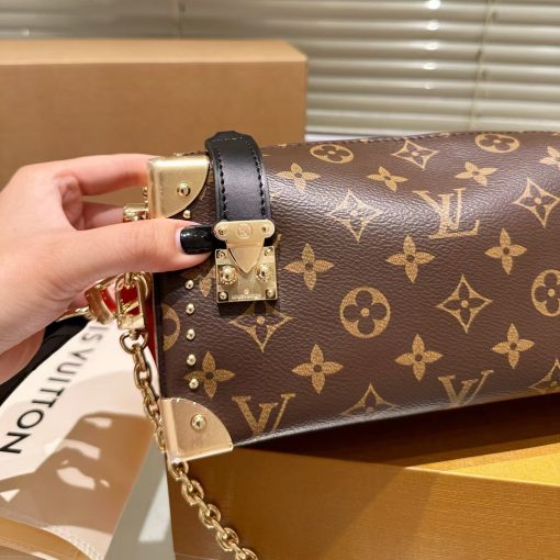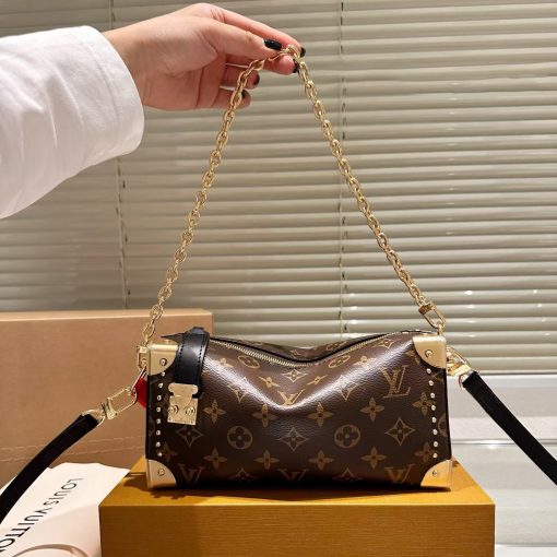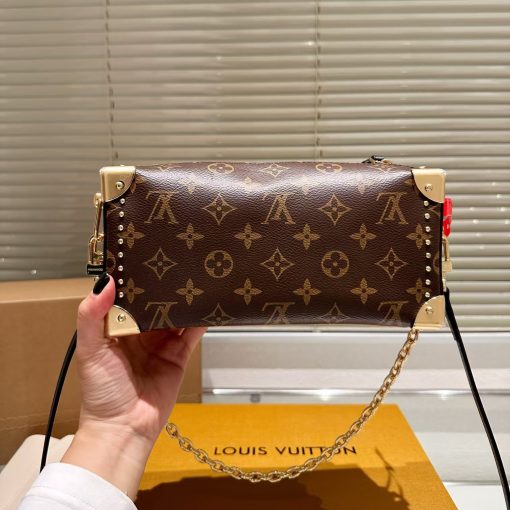 Returning to the House’s trunkmaking beginnings, Nicolas Ghesquière creates the Side Trunk MM handbag in Monogram canvas with stud trim. What strikes the eye is the singularity of the leather zip tab fitted with the iconic S-lock and the reinforced metallic corners. The wide top handle is removable as is the thin leather shoulder strap.