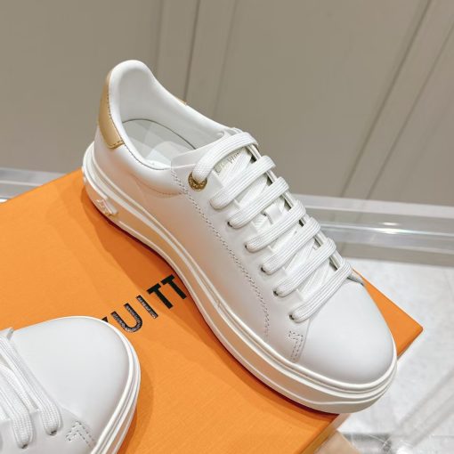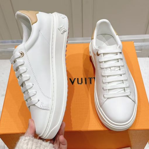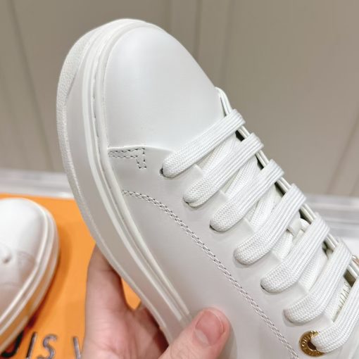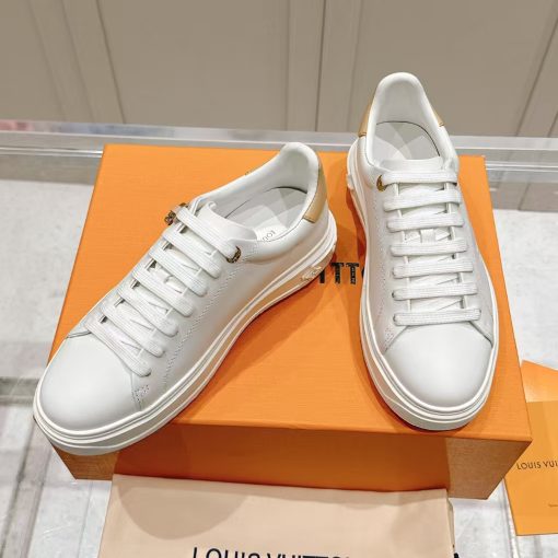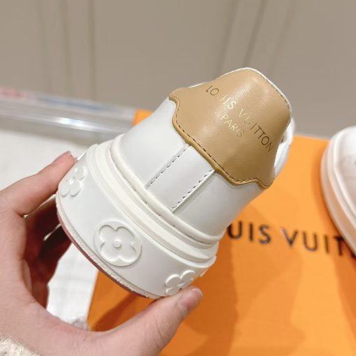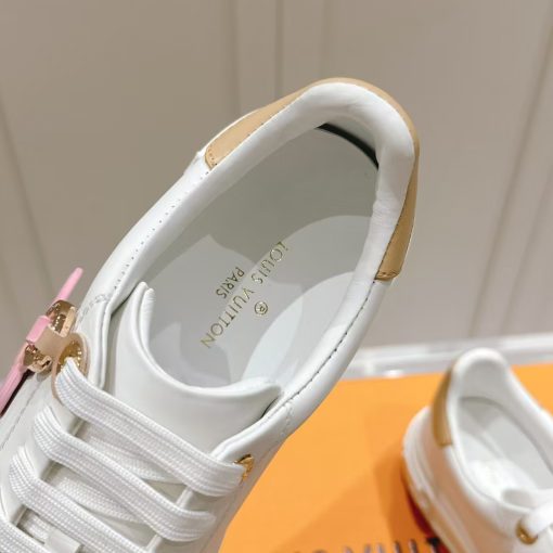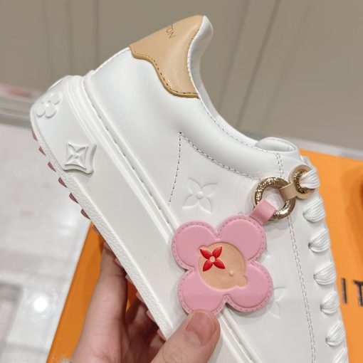 This refined interpretation of the Time Out sneaker comes in soft calf leather, which is discreetly embossed with the LV Initials and Monogram Flowers on the side. A pastel-colored charm featuring the Louis Vuitton Vivienne mascot hangs from an engraved, gold-toned ring. The back of the sneaker is trimmed with the House’s emblematic natural leather.