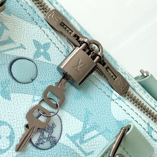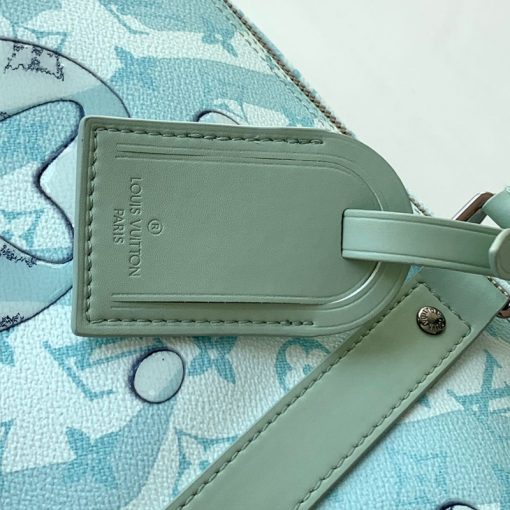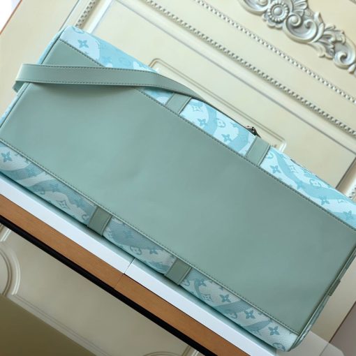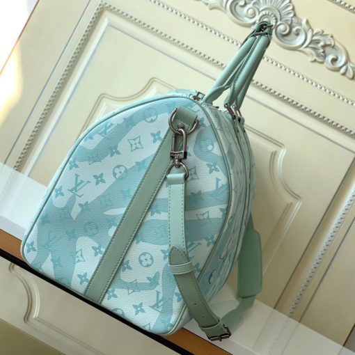 The new Keepall Bandoulière 50 bag is crafted from Monogram Aquagarden canvas, featuring an aquatic version of the Monogram pattern overlaid with stunningly realistic water-drop renderings of the Monogram Flowers and LVs. The leather lateral bands, top handles, and name tag bring a structured feel to this classic travel bag. It combines style and functionality, making it a sophisticated companion for your journeys.