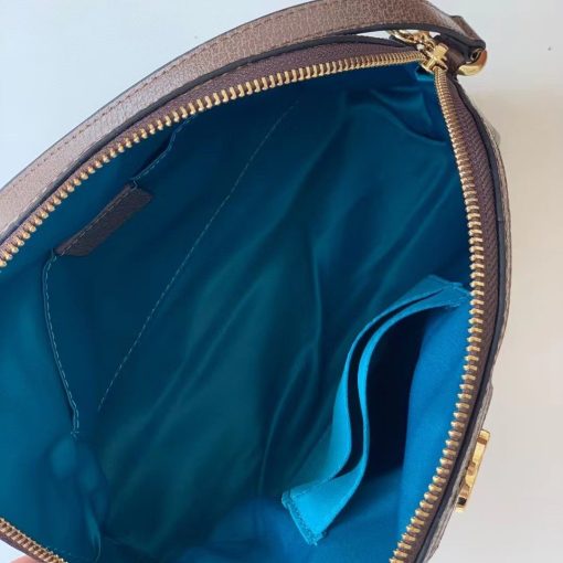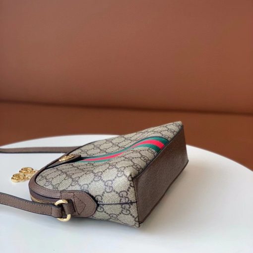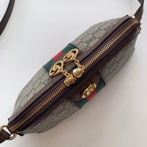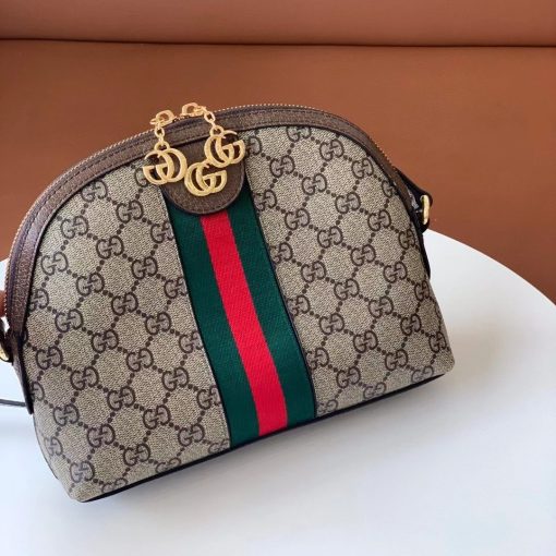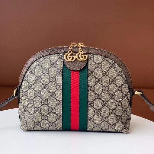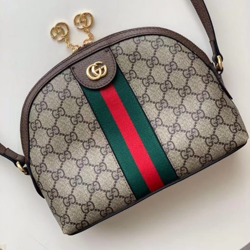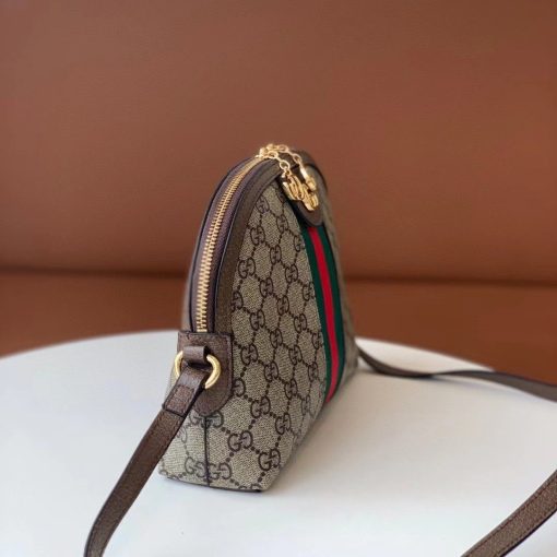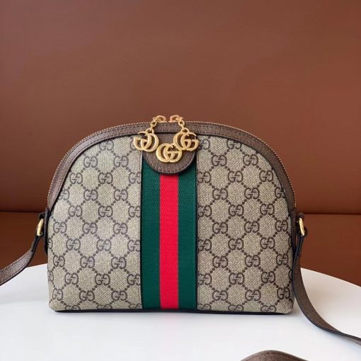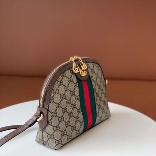 Crafted in GG Supreme canvas with inlaid Web stripe detail, the shoulder bag has a domed shape that recalls vintage designs. The Double G—an archival code—appears atop a leather tab detail and on the zipper pull.