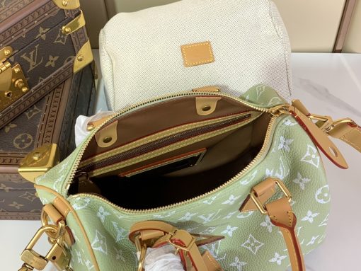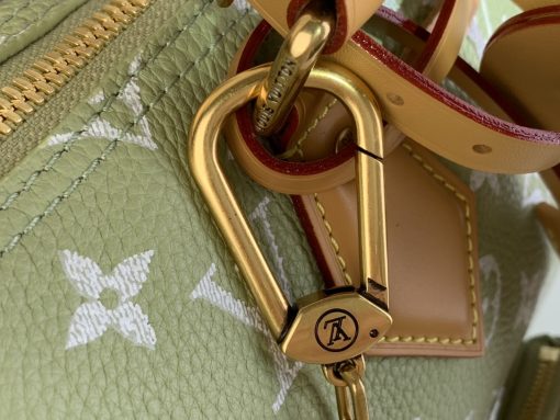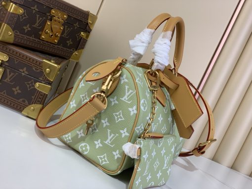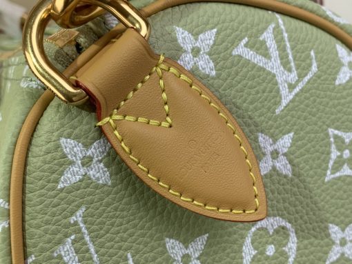 This Speedy P9 Monogram Leather Bandoulière 25 bag takes on an ultra-luxurious feel in extra-soft calfskin with a Monogram print that mimics the aspect of Monogram on canvas. Creative Director Pharrell Williams’ attention to detail is visible in all aspects of this bag, from the polished golden hardware to the lambskin lining and the exclusive plaque inside the bag.